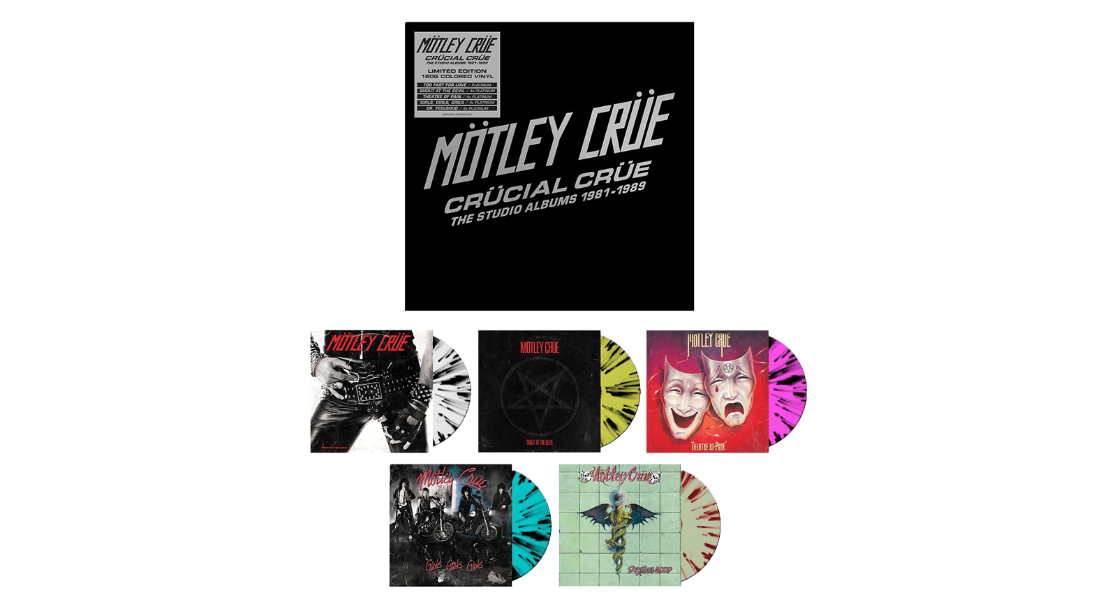 Includes five of Mötley Crüe's multi-platinum albums: 'Too Fast for Love', 'Shout at the Devil', 'Theatre of Pain', 'Girls, Girls, Girls' and 'Dr. Feelgood'.