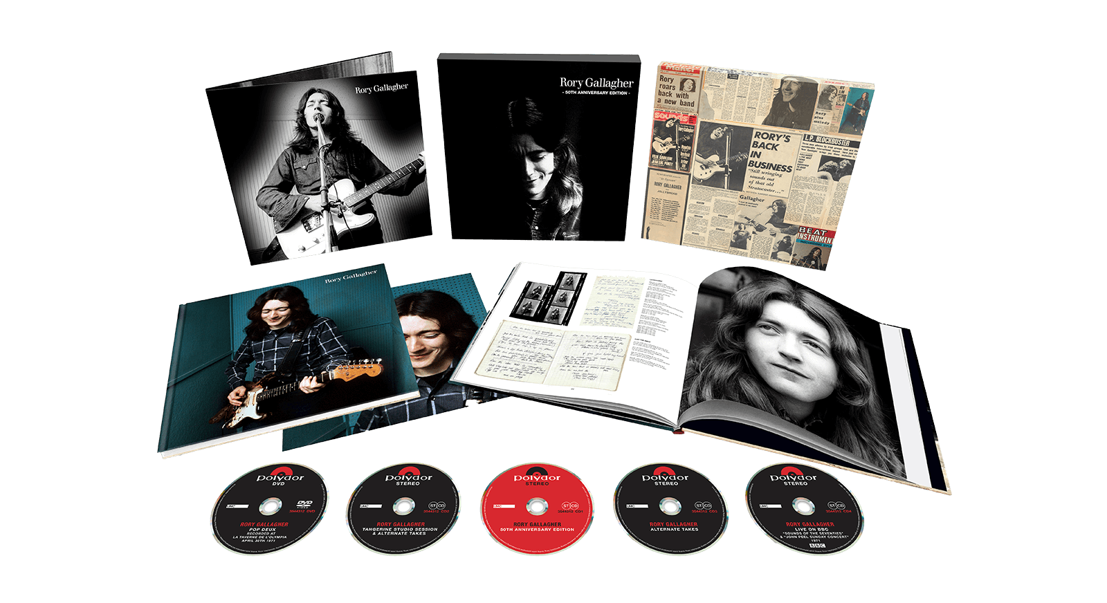 Rory Gallagher's eponymous debut solo album celebrates its 50th Anniversary. The five-disc deluxe boxset includes a brand-new mix of the original album, 30 previously unreleased alternate takes, a six-song 1971 'BBC Radio John Peel Sunday Concert', and four 1971 BBC 'Radio Sounds of the Seventies' session tracks, all mastered at Abbey Road Studios. The box includes a previously unreleased 50-minute DVD of Rory's first solo concert for the 'Pop Deux' television show, poster and 32-page hardback book.