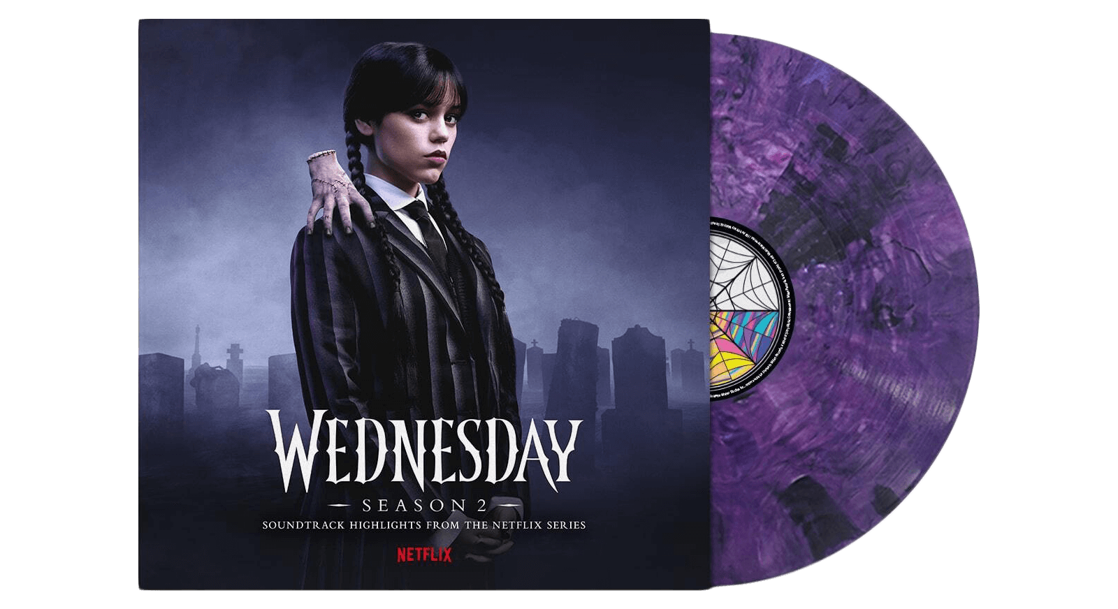 Experience the music of Wednesday Season 2 with this deluxe vinyl release, featuring songs and score from every moment of the fan-favourite series, plus two additional covers inspired by the series. Pressed on striking purple and black blended transparent vinyl, with a spot-glossed cover, custom labels, printed vinyl pockets, a poster and lyric insert, the LP features standout tracks from the show, including 'Bad Moon Rising' from the unforgettable campfire scene, and 'Zombie' from the dramatic asylum breakout. Also on the tracklist are cello soli performed by Wednesday Addams, 'Dance of the Knights' (from Prokofiev's Romeo & Juliet) and 'Don't Fear the Reaper', as well as two powerful cover songs by TikTok star Bella Poarch, 'Zombie' and 'Don't Fear the Reaper'. Additionally, the album includes 14 original score tracks by Emmy-nominated composer Chris Bacon, such as 'Raven Pyre', 'Tale of the Skull Tree' and 'Return to Nevermore'.