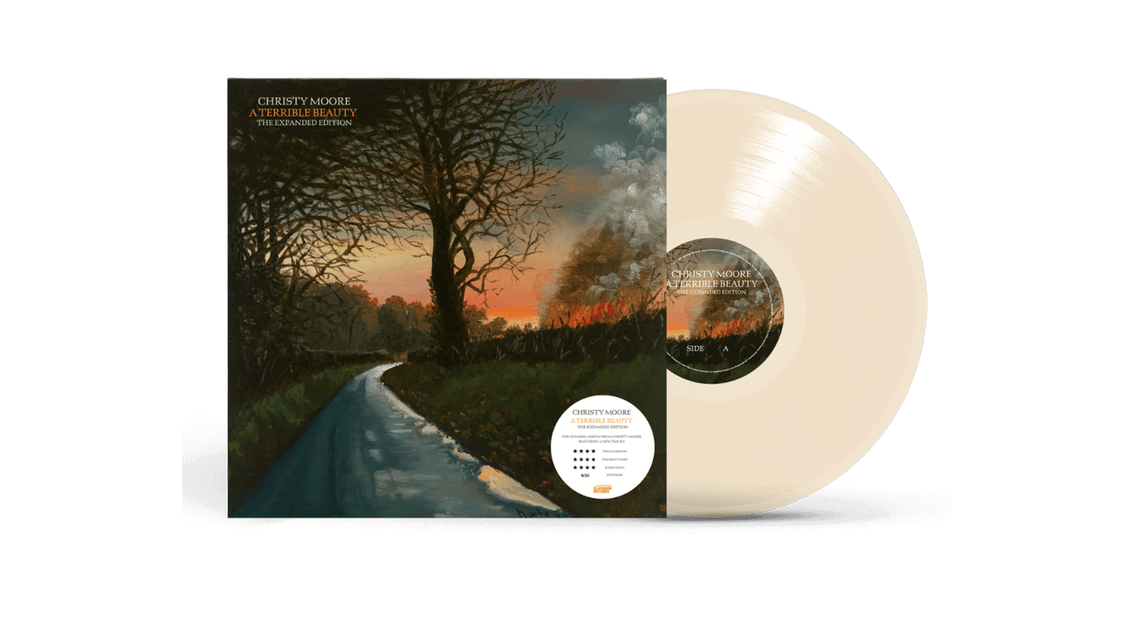 The Expanded Edition of Christy Moore’s 2025 #1 album ‘A Terrible Beauty’ arrives on November 14th on limited cream vinyl. Featuring 4 additional tracks (Sweet Thames Flow Softly, Yellow Triangle, Music to Our Ears, Butterfly) and a re-imaged version of the track ‘The Big Marquee’ which featured on the original album.