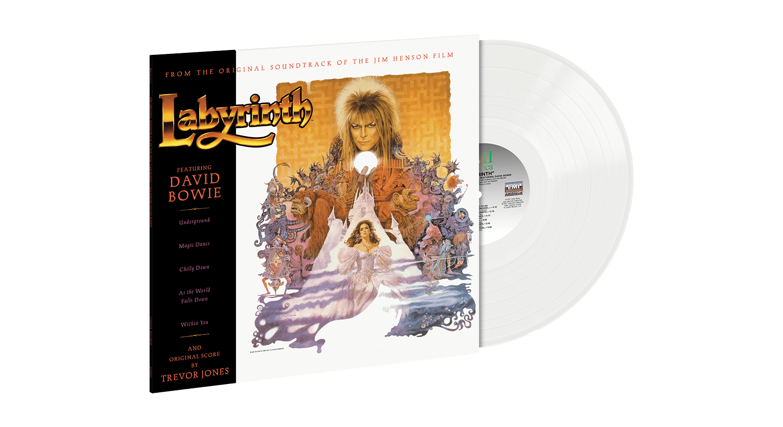 Crystal Edition LP pressing. Digitally remastered edition of the Bowie-anchored 1986 soundtrack that's been out of print on vinyl for years. Original soundtrack to the Jim Henson film. An imaginative 16-year old girl is given 13 hours to solve a labyrinth and rescue her baby brother when her wish for him to be taken away is granted by the Goblin King. Starring David Bowie and Jennifer Connelly. Labyrinth was the second of three soundtrack releases in which Bowie had a major role, following Christiane F. and preceding The Buddha of Suburbia. The soundtrack album also features Trevor Jones' score, which is split into six tracks for the soundtrack: "Into the Labyrinth," "Sarah," "Hallucination," "The Goblin Battle," "Thirteen O'Clock," and "Home at Last.